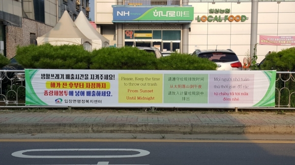 입장면은 지역주민과 입장면에 거주하는 1,400여명의 외국인을 대상으로 종량제봉투 사용 및 배출 시간 준수 등을 적극적으로 홍보해 올바른 쓰레기 배출문화를 장착시키기 위해 현수막을 게시하게 됐다.