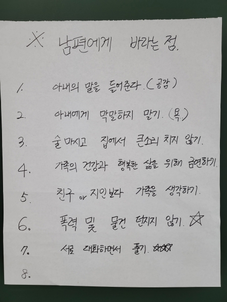 또 다른 참가자는 “부모가 자주 다투는 모습이 싫고 심지어 두렵기까지 하다는 아이들의 편지를 읽고 많이 반성하게 됐다”며 “아이들 앞에서 부부싸움을 하면 정서적인 학대가 될 수 있다는 사실을 이번 캠프를 통해 알게 됐다”며 다시는 가정폭력이 재발되지 않도록 노력하겠다는 각오를 밝혔다.