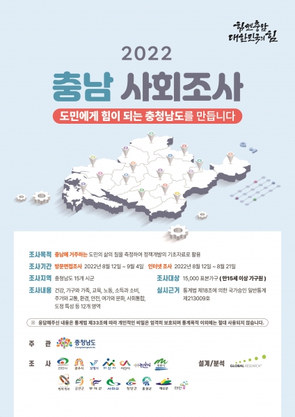 ‘충남 사회조사’는 매년 실시되는 국가승인 일반통계조사로 충남도민의 사회적 관심사를 파악해 각종 사회개발 계획 수립 및 정책 효과측정의 기초자료로 활용하기 위해 시행되고 있다.
