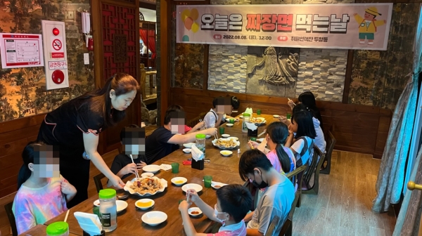이날 행사는 취팔선객잔의 후원으로 이루어졌으며 여름방학을 맞아 식사를 제대로 챙기기 어려운 취약계층 가정 아동들을 위해 코로나19로 인해 어려운 상황에도 불구하고 흔쾌히 후원을 결정하고 따뜻한 짜장면과 탕수육을 준비했다.