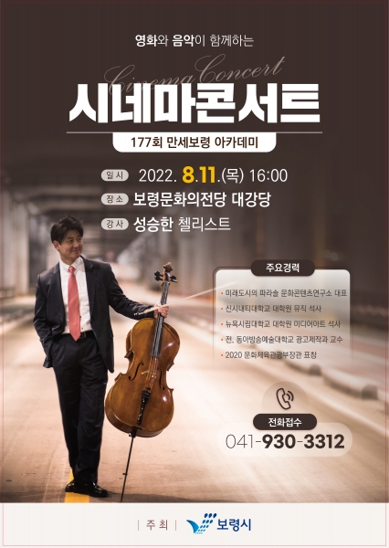 [Ytv영상스토리] 보령시는 오는 11일 오후 4시 보령문화의전당 대강당에서 첼리스트 성승한을 초빙해 ‘영화와 음악이 함께하는 시네마콘서트’란 주제로 제177회 만세보령 아카데미 강연을 연다고 밝혔다.