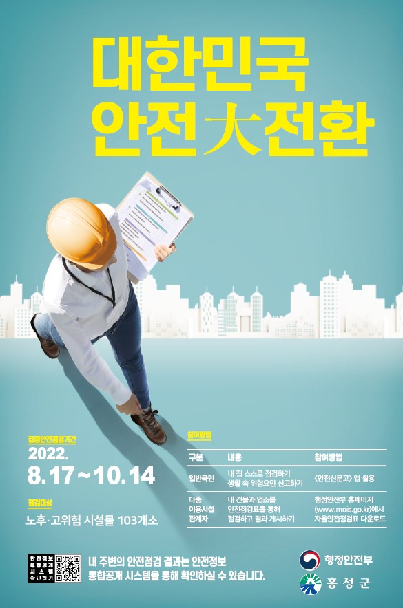 [Ytv영상스토리] 홍성군은 공무원, 홍성지역건축사협회, 한국가스안전공사, 홍성소방서 민간전문가 등을 포함한 민·관 합동점검반을 편성, 오는 17일부터 10월 14일까지 ‘2022 대한민국 안전大전환을 위한 홍성군 집중안전점검’을 실시한다.