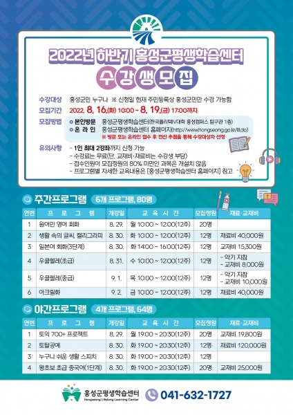 [Ytv영상스토리] 홍성군은 군민의 평생학습을 통한 지식충족 및 삶의 질 향상을 위해 오는 16일부터 4일간 홍성군평생학습센터와 신도시평생학습센터 양 센터에서 2022년 하반기 프로그램 수강생을 모집한다.