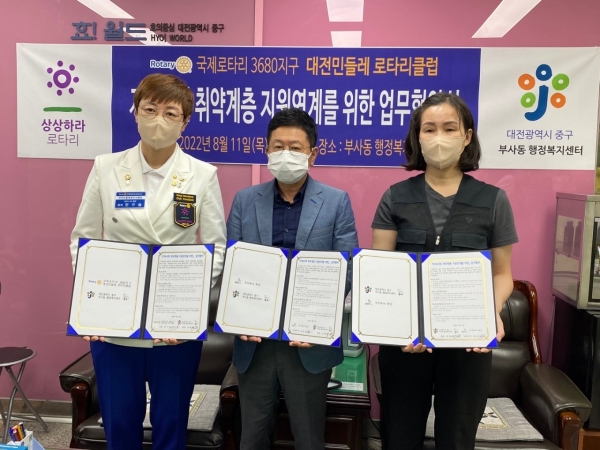 [Ytv영상스토리] 대전 중구 부사동은 11일 대전민들레로타리클럽, ㈜화인과 각각 업무협약을 체결하고 지역사회 복지향상을 위해 함께 노력하기로 뜻을 모았다고 밝혔다.