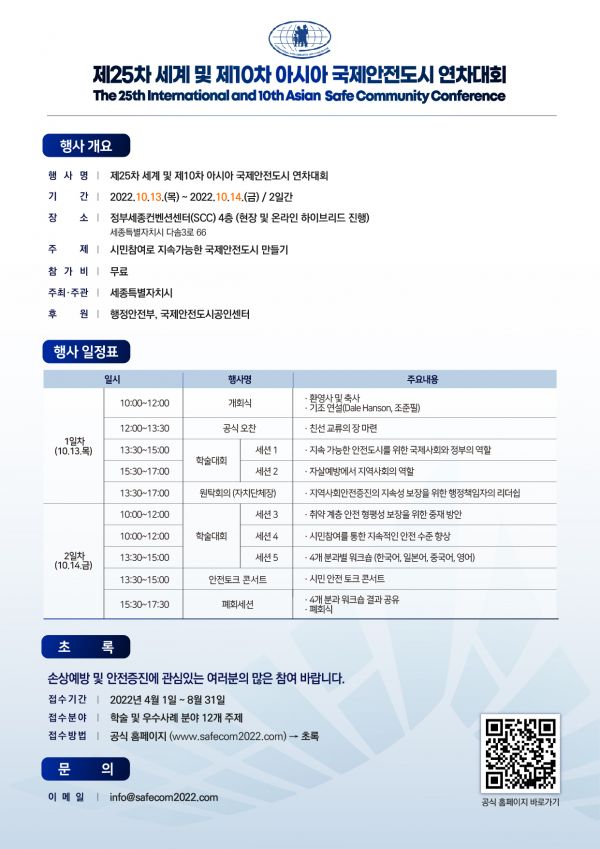 제25차 세계 및 제10차 아시아 국제안전도시 연차대회는 오는 10월 13일부터 14일까지 이틀간 정부세종컨벤션센터에서 개최를 앞두고 있다.
