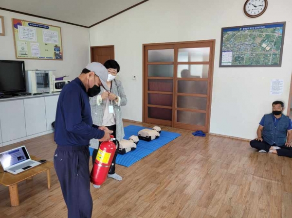 지난 16일 삽교읍 두4리 마을회관을 시작으로 8월 31일 예산읍 예산6리 경로당까지 관내 마을회관 및 경로당 총 25곳을 방문해 노인을 대상으로 체험중심 교육을 진행하며 주요 내용은 심폐소생술 자동심장충격기 사용법 소화기 사용법 보이스피싱 예방법 농기계 사고 예방법 등 생활 속 발생할 수 있는 사고 관련 내용이다.