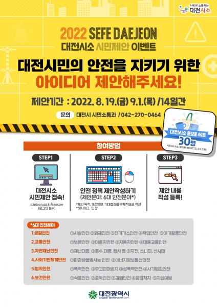 대전시 관계자는 “다양한 사회변화와 이상기후로 인해 시민의 안전을 위협하는 요인이 증가하고 있다”며 “예방안전에 대한 다양한 정책을 마련하기 위한 시민제안에 많은 시민들이 아이디어를 제안해주길 기대한다”고 말했다.