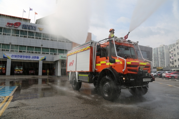 강풍을 타고 빠르게 번지는 산불에 효과적으로 대응할 수 있도록 고압 펌프를 탑재해 이동 중에도 계속 방수할 수 있도록 설계한 것이 특징이다.