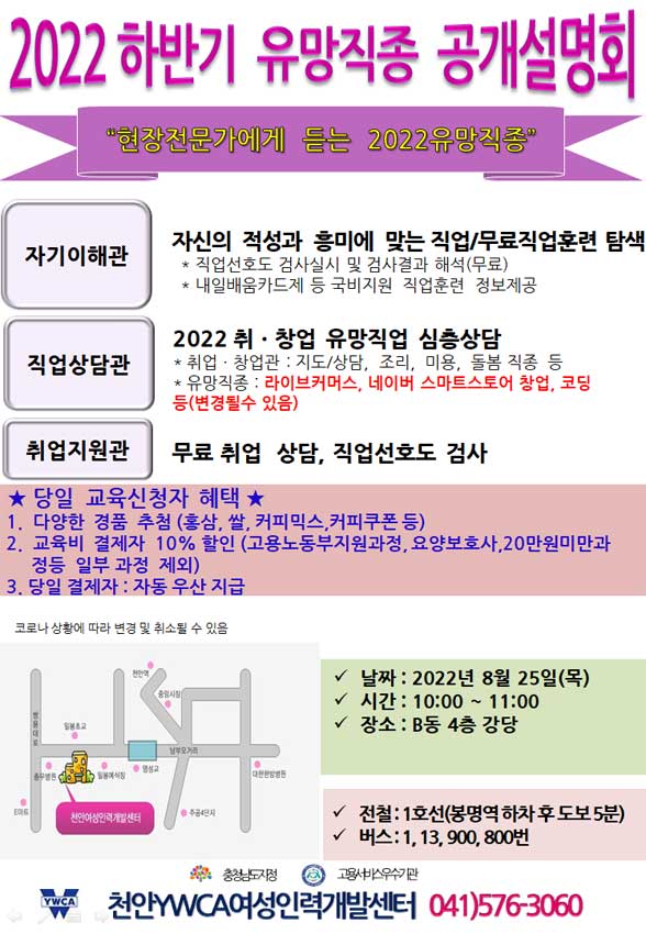 [Ytv영상스토리] 천안여성인력개발센터는 오는 25일 오전 10시 센터 4층 강당에서 ‘2022년 하반기 유망직종설명회’를 개최한다.