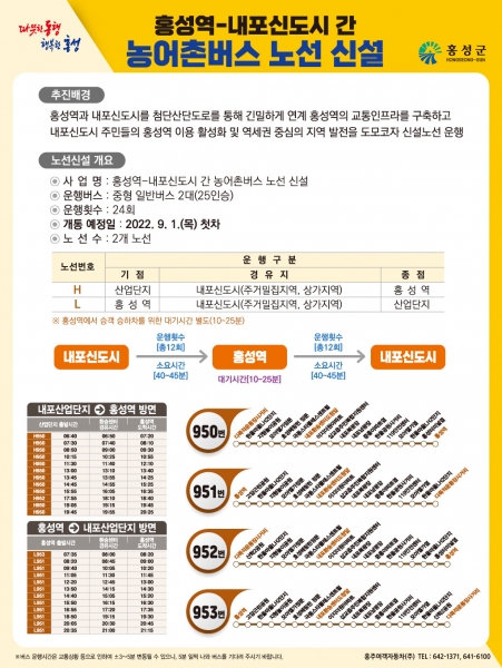 이번 신규노선은 지난해 12월 개통된 내포도시첨단산업단지 진입도로를 통과해 총 13㎞를 달리게 될 H950·H952, L951·L953 버스로 홍성역 이용 활성화 및 원도심과 내포신도시의 단일 생활권 구축으로 지역 상생발전을이끌 것으로 기대하고 있다.
