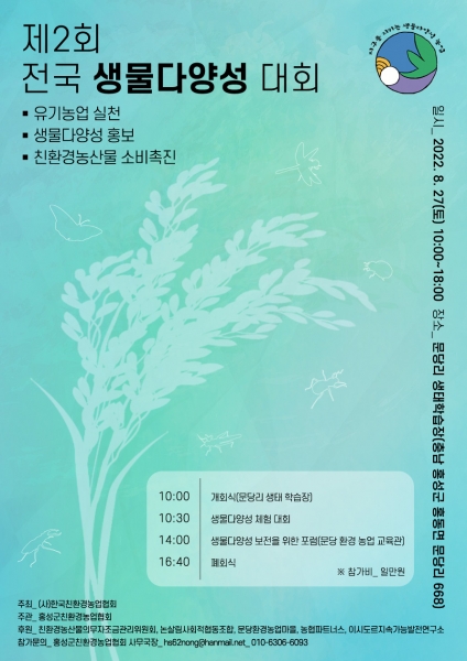제2회 전국 생물다양성 대회를 주관하는 홍성군친환경농업협회 관계자는 “자연과 공생하는 친환경농업의 우수성을 널리 알리고 지속가능한 생태계 환경을 조성하는 것은 우리의 삶과 밀접하게 닿아 있다”며 “생물다양성 보전 활동에 행정과 주민의 많은 관심과 참여를 바란다”고 밝혔다.