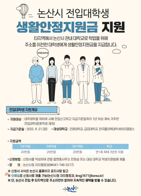 신청 기간은 오는 9월 1일부터 16일까지이며 관할 주소지 읍·면사무소 및 동 행정복지센터 또는 관내 대학교 학생지원팀으로 방문하거나 논산시 자치행정과 행정팀으로 우편 또는 이메일로 접수하면 된다.