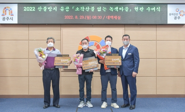 [Ytv영상스토리] 공주시는 지난 29일 시청 대백제실에서 산림청이 주관한 ‘2022 소각산불 없는 녹색마을’에 선정된 3개 우수마을에 대한 산림청장 명의의 현판을 전달했다.