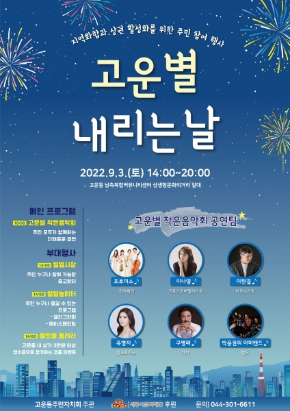 고운동과 고운동주민자치회는 오는 3일 오후 2시부터 8시까지 남측 복합커뮤니티센터 주변에서 ‘제1회 고운별 내리는 날’ 행사를 개최한다고 밝혔다.
