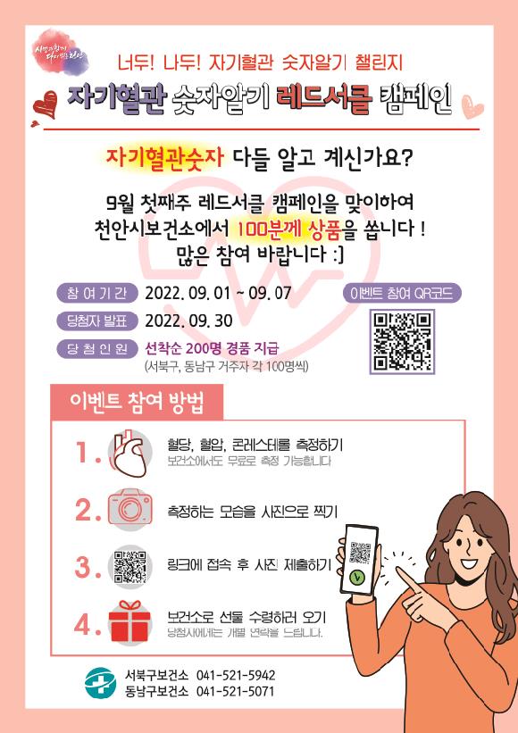 이밖에 자기혈관숫자알기 인증샷 이벤트는 보건소 또는 레드서클 존 등에서 혈당, 혈압, 콜레스테롤을 측정하고 측정하는 모습을 사진으로 찍은 뒤 이벤트 참여 QR코드로 접속해 사진을 제출하면 서북구, 동남구 거주자 각 100명씩 선착순 200명에게 경품을 지급한다.