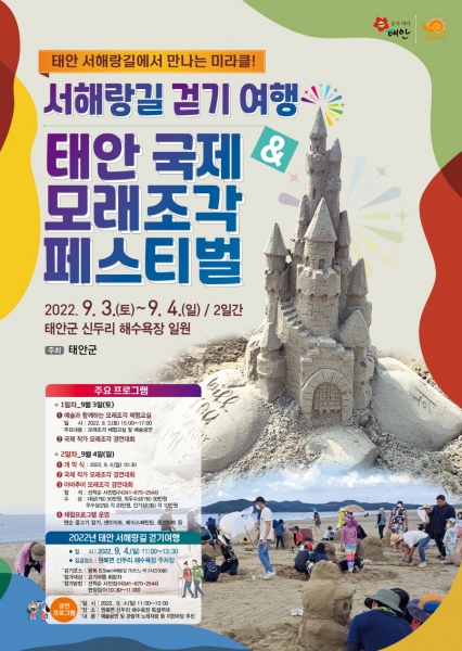 군은 3일부터 이틀간 원북면 신두리 해수욕장 일원에서 제18회 태안 국제 모래조각 페스티벌이, 4일에는 신두리 해수욕장 주차장에서 출발하는 ‘태안 서해랑길 걷기 여행’ 프로그램이 각각 개최된다고 밝혔다.