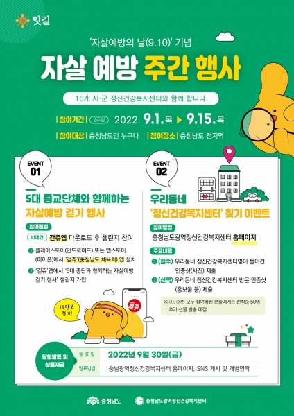 캠페인은 생명사랑문화제 5대 종교단체와 함께하는 자살예방 걷기 우리동네 정신건강복지센터 찾기 이벤트 등을 마련했다.