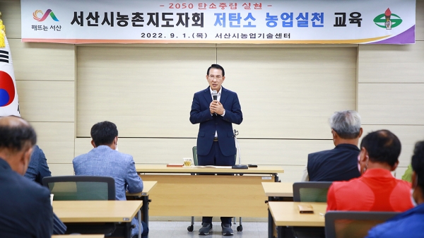 이완섭 서산시장은 농촌지도자와 소통의 시간을 통해 “농업분야 탄소중립 실천은 선택이 아닌 필수요건이 됐다”며 “앞으로 저탄소 농업기술을 실천으로 우리 농업이 한 단계 더 도약하는 계기가 되도록 노력해 달라고" 당부했다.