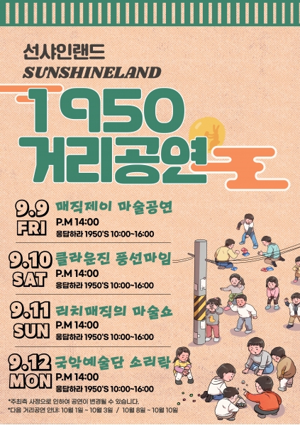 [Ytv영상스토리] 논산문화관광재단은 추석연휴 고향을 방문하는 귀성객 및 방문객들을 위해 오는 9일부터 12일까지 선샤인랜드 1950스튜디오에서 거리공연을 개최한다.