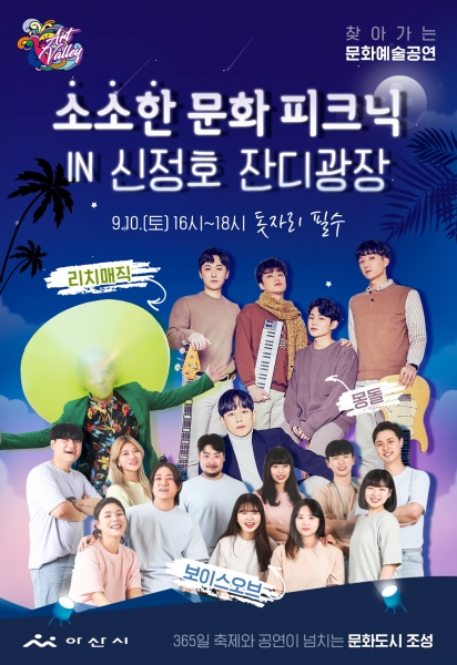 시 관계자는 “신정호 잔디광장에서 열리는 이번 ‘소소한 문화피크닉 IN 신정호 잔디광장’이 공연장을 찾은 모든 사람이 함께 즐거움을 나누는 시간이 되길 바란다”며 “‘365일 축제와 공연예술이 넘치는 문화도시 아산’을 만들기 위해 최선을 다하겠다”고 말했다.