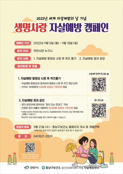 천안시민 누구나 프로그램 생명사랑동영상 시청 및 퀴즈참여 자살예방표어 공모 모바일우울선별검사 등에 참여할 수 있다.