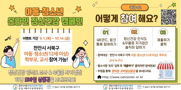 올 10월 14일까지 관내 12세 이상 아동·청소년, 학부모, 교사가 천안시서북구정신건강복지센터 누리집 또는 QR코드로 접속하면 정신건강인식도 조사 우울감 마음 건강검진을 받을 수 있다.