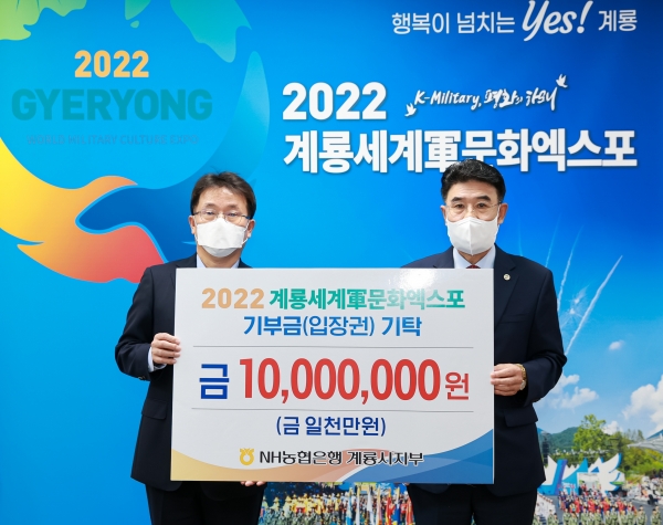 軍문화엑스포 공동조직위원장인 이응우 시장은 지난 5일 시장실에서 김동진 NH 농협은행 계룡시 지부장으로부터 軍문화엑스포 성공기원 기부금 1천만원을 기탁받았다.