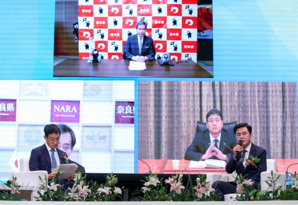 토론자로는 김 지사가 직접 참여하고 일본 가바시마 이쿠오 구마모토현지사와 무라이 히로시 일본 나라현 부지사, 동스당 중국 허베이성 에너지국 부국장 등이 온라인으로 참여해 의견을 주고받았다.
