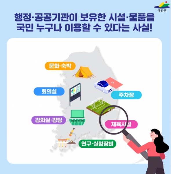 예산군은 2021년부터 자원등록과 현행화 등 준비과정을 거쳐, 올해 공유누리 활성화를 위한 자체 추진계획을 바탕으로 주민자치 및 도서관 프로그램, 공중화장실, 공구대여, 전기차 충전소 등 중점자원을 신규 등록하는 등 개방자원 확대에 나섰다.