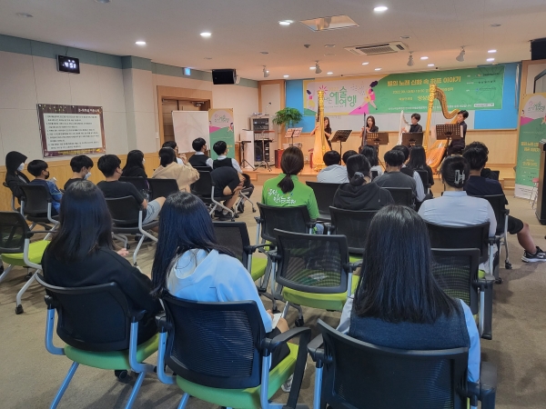 [Ytv영상스토리] 금산청소년미래센터는 지난 13일 2층 다목적강당에서 신나는 예술여행 2차 공연 앙상블 더 하프의 ‘별의 노래 신화 속 하프 이야기’를 개최했다.