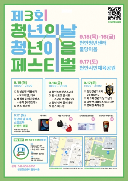 17일에는 천안시민체육공원에서 청년의 날 기념식 천안청년가요제 로컬싱어 경연 MBTI검사, 퍼스널컬러, 캔들·가죽 공예, 게임부스 등 다양한 체험부스가 운영된다.