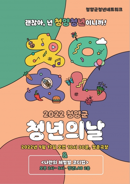 청년네크워크가 기획하고 주도하는 청년의 날 행사는 청양고 댄스팀 ‘ING’의 공연을 시작으로 자랑스러운 청년상 시상, 주민들의 응원 메시지 상영, 청양 정착을 꿈꾸는 유튜버 가수 이수현 씨의 공연, 청년정책 우수사례 발표, 푸짐한 상품이 걸려있는 ‘희망 풍선 다트 게임’ 순으로 진행된다.