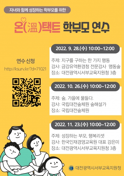 ‘온택트 학부모 연수’는 하반기 3회 운영계획으로 연수참여 신청은 9월 20일까지 서부 관내 초등학교를 통해 안내된 신청 URL주소 및 QR코드(), 대전서부교육지원청 홈페이지 팝업창을 통해 가능하다.