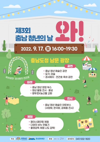 오후 4시부터 도청 남문 잔디광장에서 펼쳐지는 문화예술 축제에서는 청년예술인의 버스킹 마술 공연 잔디밭 요가 청년 창업자의 부스 전시·체험행사 등 다채로운 프로그램을 즐길 수 있다.