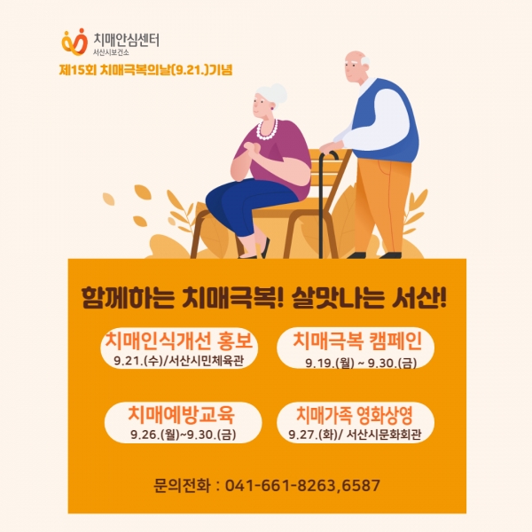 9월 27일에는 서산시문화회관 소공연장에서 치매환자 가족의 문화생활을 지원하고 치매 가족 간 정서 및 정보 교류를 위해 힐링영화‘장수상회’를 상영할 예정이다.