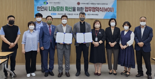 [Ytv영상스토리] 천안시복지재단은 지난 16일 사회복지법인 세종충남가톨릭사회복지회와 나눔문화 확산을 위한 업무협약을 체결했다.