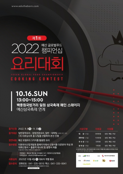 에 따라 군과 외식산업 육성을 위해 개최하는 첫 대회로 다음달 개최예정인 제6회 예산장터 삼국축제 기간 중 10월 16일에 예산상설시장 축제장 주 무대에서 진행될 예정이다.