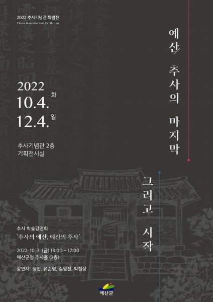 한편 특별전 연계 행사로 오는 10월 7일에는 군청 추사홀에서 정민 교수 외 3인의 추사 전문가가 ‘추사의 예산, 예산의 추사’라는 주제로 학술강연회를 개최한다.
