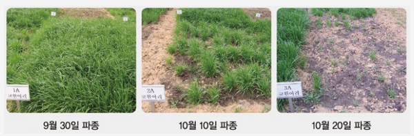 단, 월동 사료작물은 파종 시기가 늦는 경우 생존율이 낮아져 이듬해 봄 초기 생육이 나쁘고 생산성이 떨어진다.