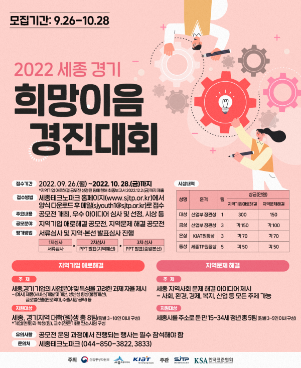 2022년 희망이음 경진대회는 세종특별자치시의 청년들이 기업애로 및 지역사회 문제해결을 위한 아이디어를 제시하는 공모전이다.