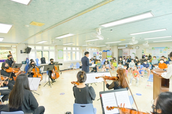[Ytv영상스토리] 홍성군립오케스트라의 ‘찾아가는 교과서 음악회’ 공연이 전교생 31명의 학생이 참여한 가운데 지난 20일 서부면 신당초등학교에서 열렸다.