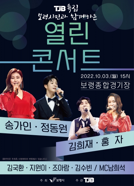 보령시가 주최하고 TJB가 주관 방송하는 이번 콘서트는 10월 1일 ‘보령시민의 날’을 맞아 ‘2022보령해양머드박람회’와 ‘제25회 보령머드축제’의 성공개최 주역인 보령시민을 격려하고 2022충청남도체육대회 개최를 축하하기 위해 마련됐다.