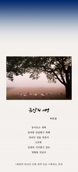 군 관계자는 “금산의 이야기를 사진시로 표현해 이번 공모에 참여해주신 모든 분들게 감사드린다”며 “인삼축제장에서 공개되는 사진시 작품들이 축제를 환하게 밝히는 꽃들이 됐으면 한다”고 말했다.