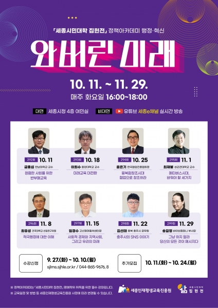 수강신청은 10월 10일까지 ‘세종시민대학 집현전 학사관리시스템’에서 대면·비대면으로 신청할 수 있다.