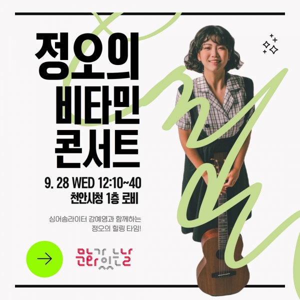 먼저 점심시간을 이용해 천안시청사에서 열린 개방공연 ‘정오의 비타민 콘서트’는 싱어송라이터 강예영이 달콤한 시간을 선사했다.