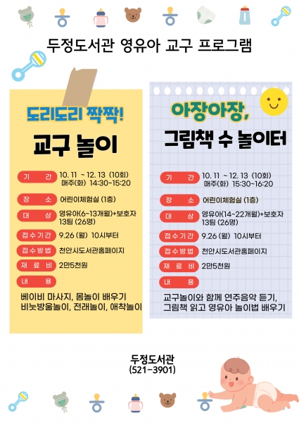 [Ytv영상스토리] 천안시 두정도서관은 10월부터 영유아를 대상으로 아이들이 도서관과 친숙해지고 부모와 자녀 간의 유대감을 형성하는 교구 프로그램 ‘도리도리 짝짝 교구놀이’와 ‘아장아장, 그림책 수 놀이터’를 운영한다.