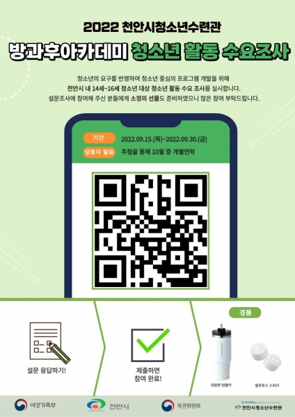 이번 설문조사는 천안시 내 14세~16세 청소년들의 방과 후 활동 요구를 반영한 청소년 중심의 2023년 방과 후 프로그램 개발을 목적으로 실시된다.