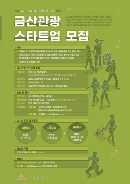 금산관광 스타트업 모집에 관한 자세한 내용은 금산축제관광재단 DMO사업단에 문의하면 된다.