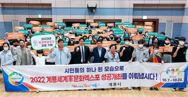 지난 28일 엑스포 개최에 따른 시민 관심과 참여 증가를 위해 열린 ‘명사초청 시민아카데미’ 강연에서 이응우 시장을 비롯한 관계 공무원, 시민이 참석한 가운데 2022계룡세계군문화엑스포 홍보대사인 최영재 마스터와 함께 ‘엑스포 성공개최’와 ‘평생학습도시 지정’을 기원하는 행사를 개최했다.