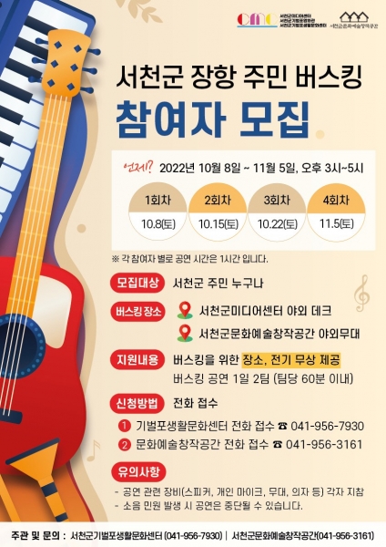 버스킹 장소는 서천군미디어문화센터 야외 데크 서천군문화예술창작공간 야외무대 2곳으로 장소 및 전기는 무상 제공되지만 공연 관련 장비는 참여자가 직접 준비해야 한다.